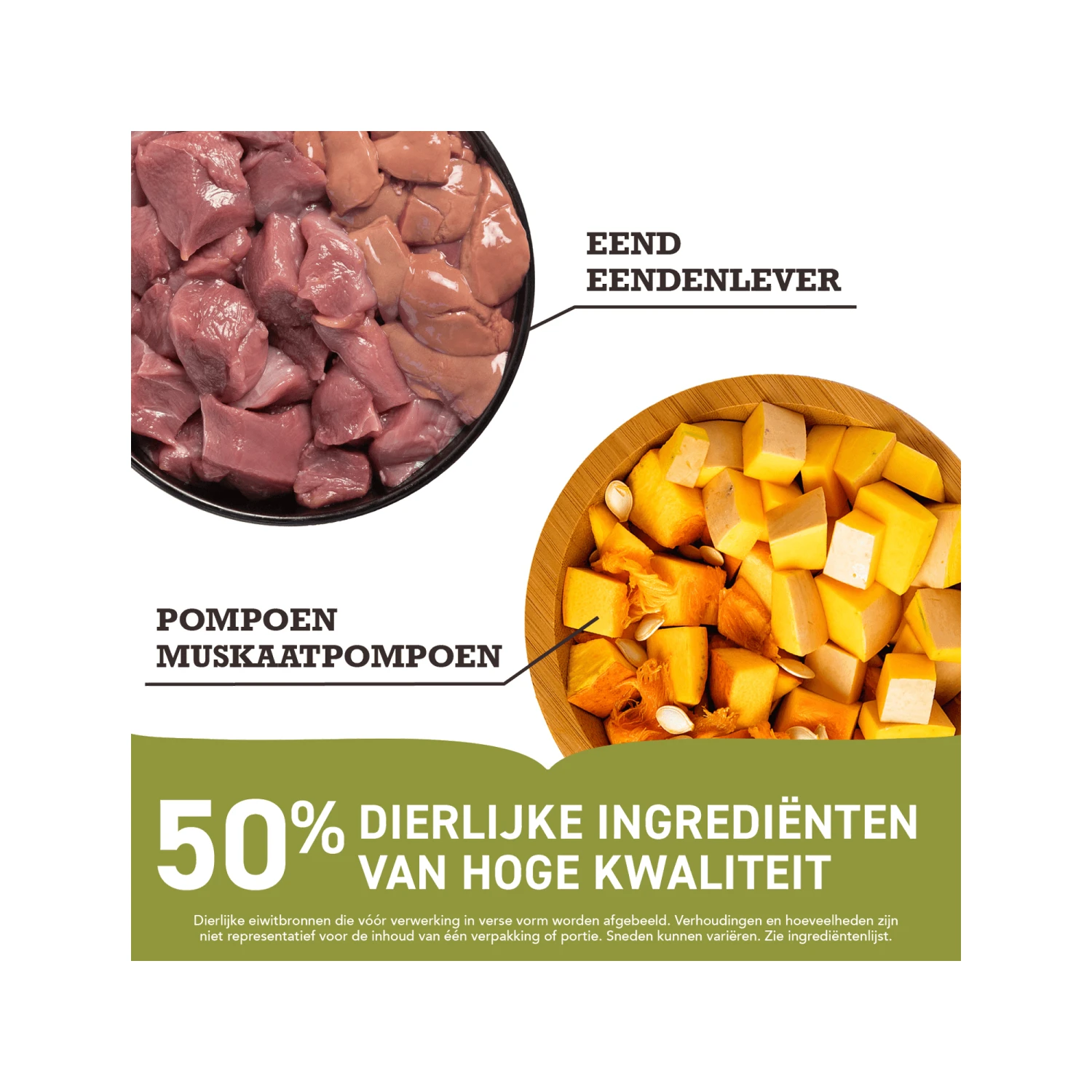 Verse eend (18%), eendenvleesmeel (17%), hele groene erwten, hele rode linzen, eendenlever + eendenhart + eendennier (7%), eendenvet (6%), verse peren (4%), hele kikkererwten, groene linzen, gele erwten, gedroogd eendenkraakbeen (2%), linzenvezels, zee-alg (1,2%), pompoen, bruinwier, gevriesdroogde eendenlever (0,1%), zout, verse hele cranberries, verse hele blueberries, chicoreiwortel, geelwortel, mariadistel, grote klis, lavendel, heemst, rozenbottel.