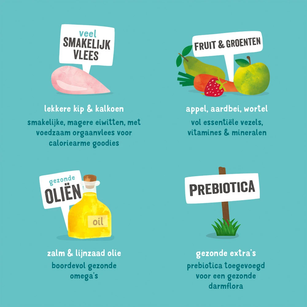 Kip 52%, kalkoen 8%, wortel 2%, mineralen, mannan-oligosachariden (MOS), tomaat (gedroogd) 0,25%, appels (gedroogd) 0,25%, lijnzaadolie, zalmolie, fructo-oligosachariden (FOS), bosbessen (gedroogd) 0,13%, aardbeien (gedroogd) 0,05%, gedroogde venkel 0,01%, gedroogd karwijzaad 0,01%, gedroogd duizendblad 0,01%, gedroogde braambessenblaadjes 0,01%, gedroogde maretak 0,01%, gedroogde kamillebloesem 0,01%, gedroogde gentiaanwortel 0,01%, gedroogd duizendguldenkruid 0,01%.