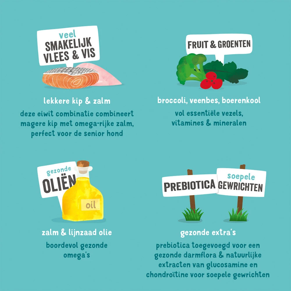 Senior – Kip & Zalm is complete natvoeding waar uw senior hond van 8+ jaar oud van zal smullen! Het recept bevat heerlijke stukjes kip en zalm. Het vlees is niet bewerkt, overgaar of gedroogd; dat is namelijk moeilijker om te verteren voor uw hond. De voeding is graanvrij en is aangevuld met een gezonde combinatie van fruit, groente en kruiden.